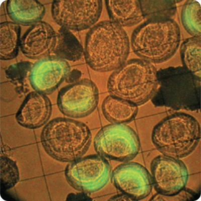 保全活動をはかる技術の一環として、二枚貝浮遊幼生の供給経路解析を行うための基礎的知見について、蛍光抗体法による幼生の検出の取り組みを進めています。