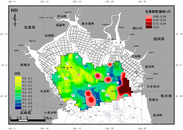 HSI:2007年8月の広域底質調査、生息密度 :佐賀県有明水産振興センター資料を利用