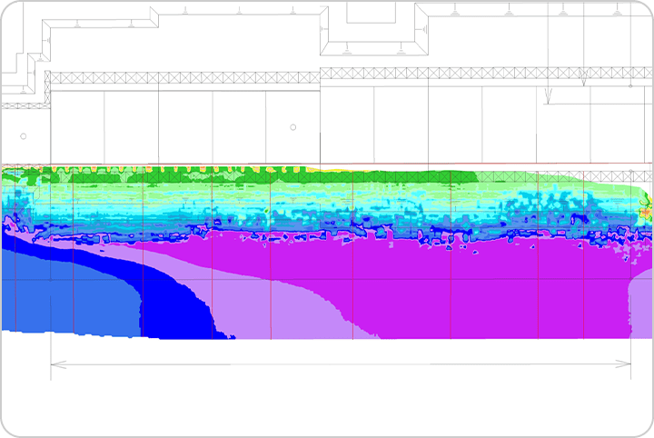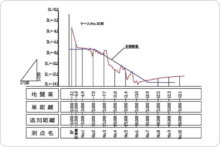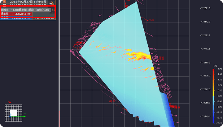 得られた水深データは、既存のデータや設計計画図(標準断面図や3次元図)との比較・解析を行い、