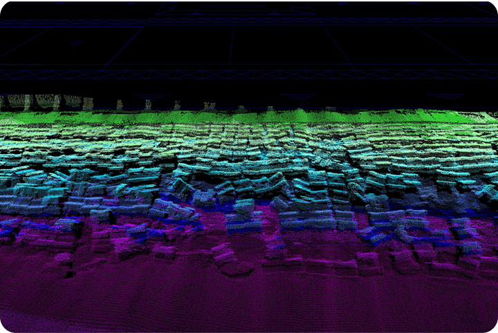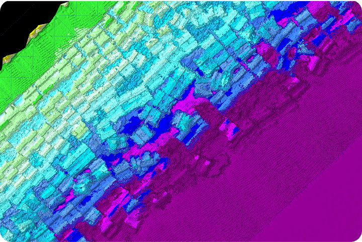 マルチビーム測深結果を用いて、地形データ(3次元点群データ)の管理・解析を行います。また、設計データの作成や出来形管理、浚渫土量などの数量計算を行います。水路測量は一般の深浅測量と異なり、測量区域内の浅所を漏らさず確認するもので、高度な技術と高い精度を必要とし、成果資料は、海上保安庁の審査を受けて海図に反映されます。弊社では多数の水路測量の実績を有しています。