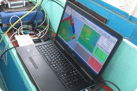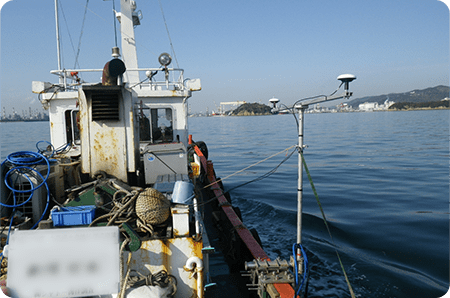 音響測深機を用いて行う深浅測量は、深さの情報と同時にGNSS受信機による位置情報を取得します。現在では地形を面的に計測するマルチビーム音響測深機を用いた3次元計測が主流となっています。水路測量は、船舶交通の安全のため、海上保安庁が発行する海図の内容に差異が生じた場合に、海図を改訂するために行う測量(海図補正測量)です。弊社は、国土交通省が進めている港湾分野のi-Construction( ICT;Information and Communication Technology を活用した情報の3次元化)に沿って、浚渫工事など港湾整備事業におけるマルチビーム測深機を用いた深浅測量を行っています。