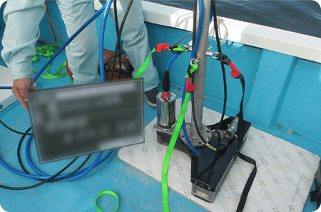 深浅測量では、船に取り付けた水中センサーから発信した音波が底面で反射し、受信するまでの時間を元に深さを計測しています。計測値は、水中センサーの下面から水底面まであり、そのため、現場で得られた測深データから水深データを得るために、各種補正を行います。